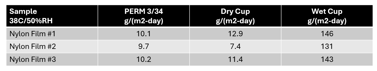 El nailon es un material conocido por su sensibilidad a la humedad. Al comparar la tasa de transmisión de oxígeno (OTR) y la tasa de transmisión de vapor de agua (WVTR) de películas de nailon, es importante prestar mucha atención al método de prueba utilizado. Por ejemplo, los resultados de WVTR para una película de nailon típica pueden variar significativamente según si la prueba se realiza según las normas ASTM E96 o ASTM F1249. Incluso cuando ambas pruebas utilizan el mismo gradiente de fuerza impulsora (p. ej., 50 % de humedad relativa), el nivel de transmisión puede variar según se utilice un método de copa seca o húmeda (véase la Tabla 1).