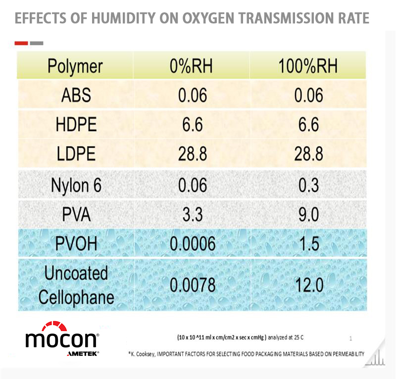 Las pruebas de permeación de estructuras sensibles a la humedad pueden ser engañosas debido a los diferentes niveles de sensibilidad a la humedad. Las propiedades de barrera de un material pueden cambiar según el tipo de permeante y el nivel de humedad. Una estructura que bloquea eficazmente el oxígeno no necesariamente es una buena barrera contra el vapor de agua. Por eso, muchas películas de embalaje son multicapa, y cada capa cumple una función de barrera específica para diferentes especies químicas.