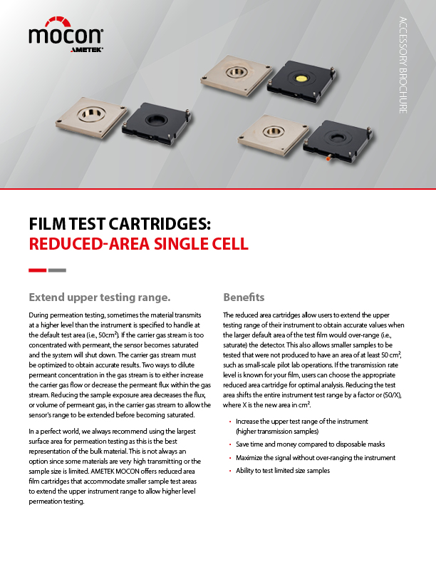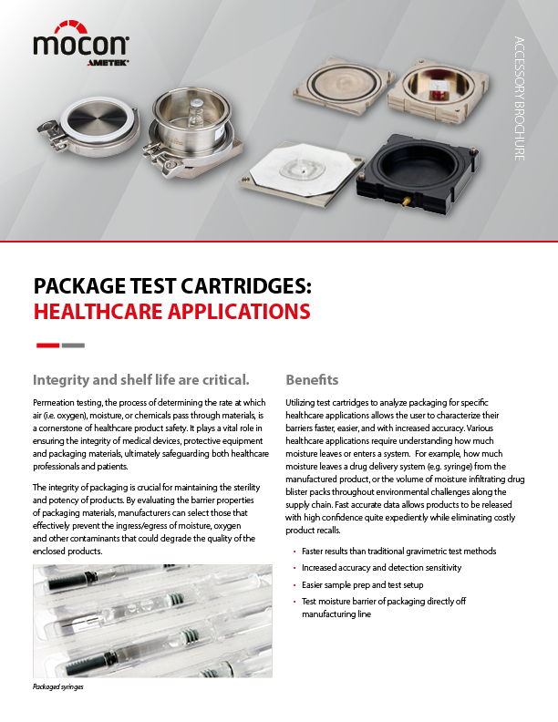 Hace varios años, el equipo de AMETEK MOCON decidió que debía existir un método mejor para probar paquetes con precisión, sin tanto trabajo ni complicaciones. Por ello, inventamos una serie de cartuchos de prueba para diversos tipos de paquetes comunes que simplificaron el montaje y mejoraron los resultados de las pruebas. Los clientes que utilizan estos cartuchos reportan un aumento en las pruebas, menos trabajo y resultados más repetibles.s.