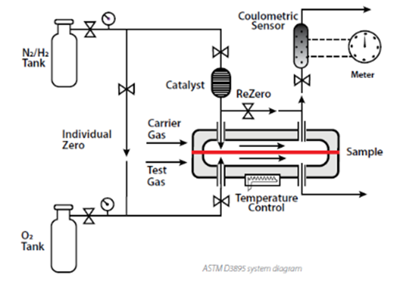 ASTM D3985/F1927 Este es el método clásico del sensor coulométrico, que ha sido el estándar de la industria desde 1981. Una cara de la película (o del envase, en el caso de la norma F1927) se expone a oxígeno seco, y la cara opuesta se barre con nitrógeno seco (la norma ASTM F1927 incorpora humedad a los gases). El oxígeno transmitido se conduce a un sensor coulométrico (electroquímico), que lo cuantifica.