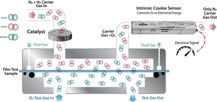 - Cualquier gas de oxígeno que se transmita a través de la muestra es arrastrado por el gas nitrógeno a un detector culombimétrico, donde se mide el oxígeno que se transmite.