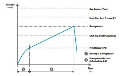 - La presión en el paquete aumenta a la tasa preestablecida hasta que el paquete revienta o hasta que se alcanza la presión máxima especificada.