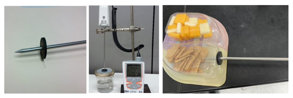 - Adjunte un tabique al paquete de muestra. Utilizamos el tabique negro Dansensor® Lippke® 5000, que se adhiere a la superficie del paquete, se ajusta perfectamente al diámetro de la sonda y evita que la migración de la humedad del aire de la habitación afecte la lectura.Con una punta afilada personalizada adherida a la sonda, perfore el paquete, dejando la punta de la sonda aproximadamente 1” en el área de espacio libre.